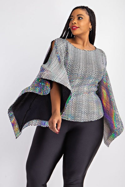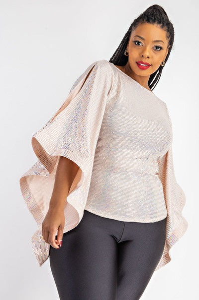 Batwing Sequins Top 1 piece Hologram Top Colors: Champagne, Silver/Black Sizes: 1X (14/16), 2X (18/20), 3X (22/24)