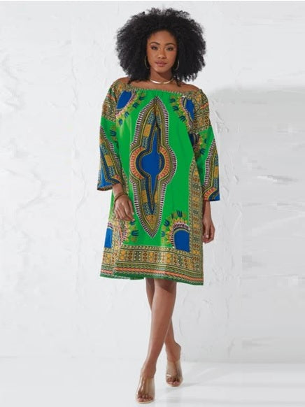 Dashiki Off Shoulder Dress 1 piece Dress Colors: Lime, Orange Sizes: One Size fit up to size 3X