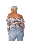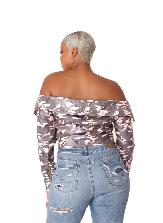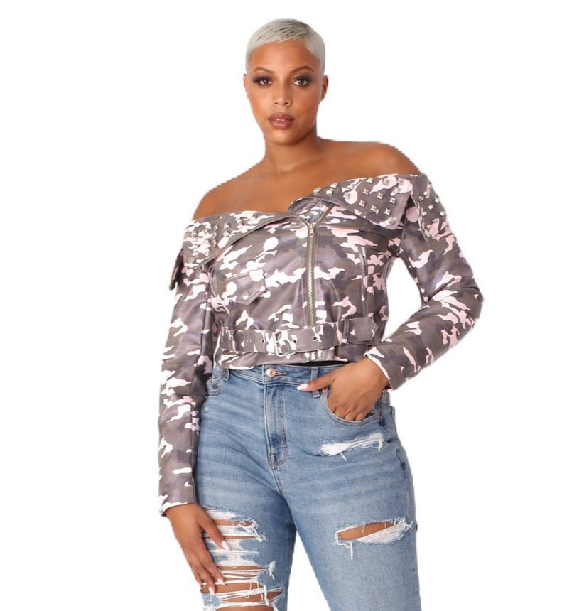 1 Piece Off the Shoulder Camouflage Leather Jacket