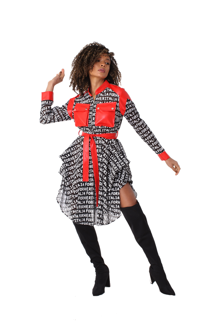 For Her NYC 82006 1 piece Faux Leather Trim Dress Color: Black/Red Sizes: S, M, L, XL, 1X, 2X