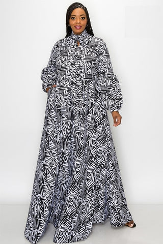 Geometric Maxi Dress 1 piece Bow Dress Colors: Black/White Sizes: 1X (14/16), 2X (18/20), 3X (22/24)