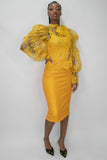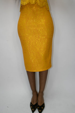 Lace Overlay Pencil Skirt Length: 28" Colors: Gold Sizes: S (4/6), M (8/10), L (12/14), XL (16), XXL (18), XXXL (20)